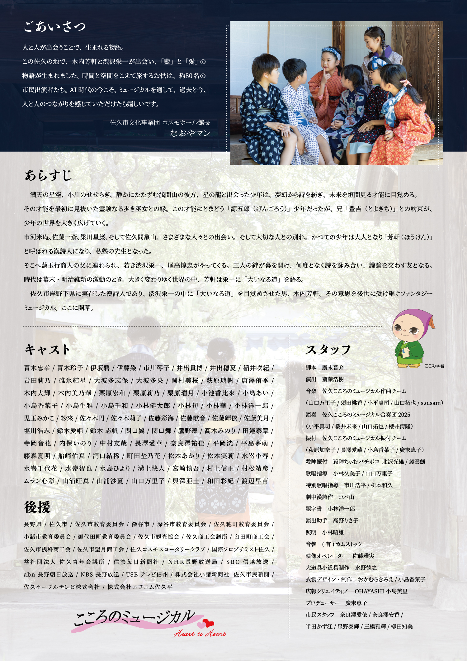 大イナル道〜木内源五郎芳軒伝奇〜 2025 9/04 公開作品 2025年9月4日 公開作品 Share! URLをコピーしました! 🎭✨稽古場レポート✨🎭 〜8/30・31〜 📣✨みんなでPR活動✨📣 関連記事 あぜ道に命のわだち〜若月俊一(佐久総合病院名誉総長)物語〜 2024年11月9日 あぜ道に命のわだち〜若月俊一(佐久総合病院名誉総長)物語〜 2023年11月18日 佐久の夜の夢 2022年11月12日 黄金の群れ〜水の調べは明日への扉〜 2021年11月13日 ネコたちのトウモロー 2021年1月30日 心の中の光となって〜人間物語 丸岡秀子の半生〜 2019年11月9日 「心の中の光となって〜人間物語 丸岡秀子〜」 2018年11月11日 時空をまたぐ汽笛〜佐久に鉄道を敷こう〜 2017年11月12日